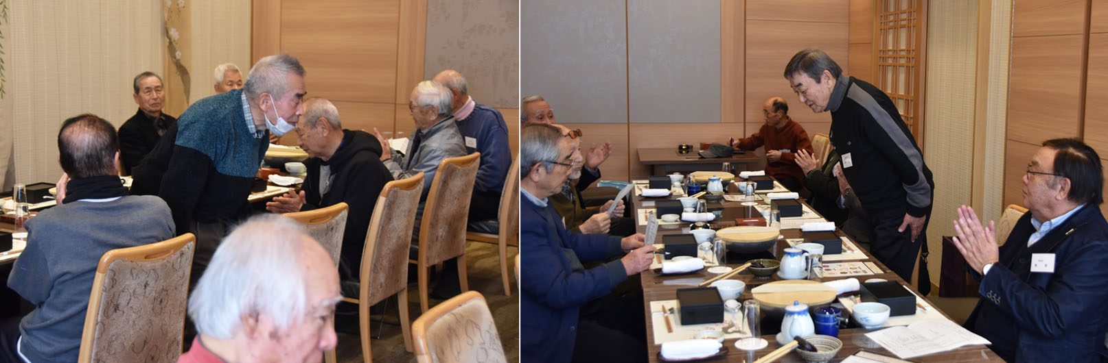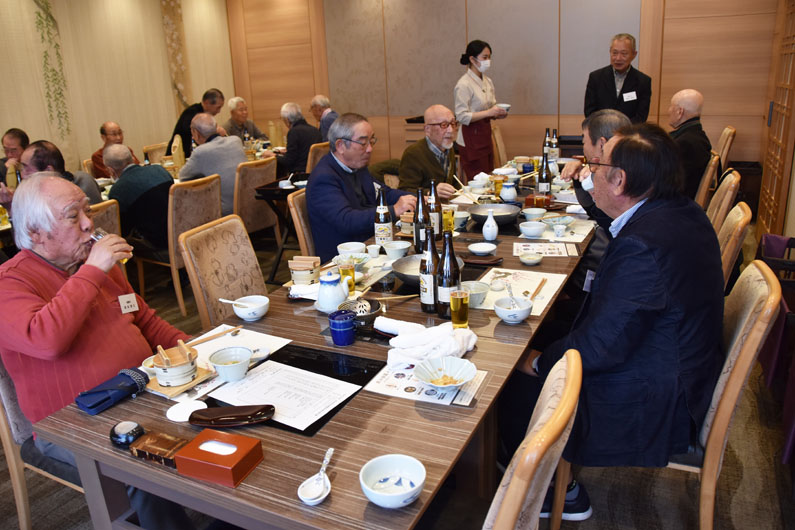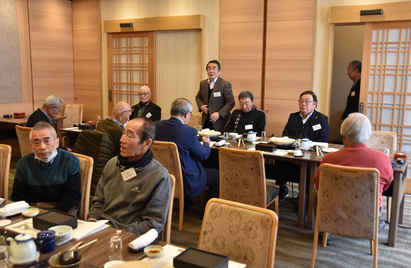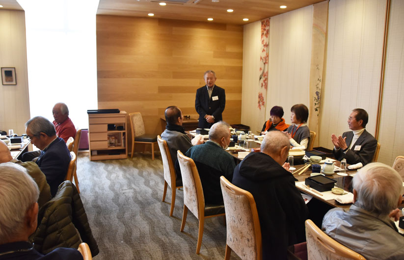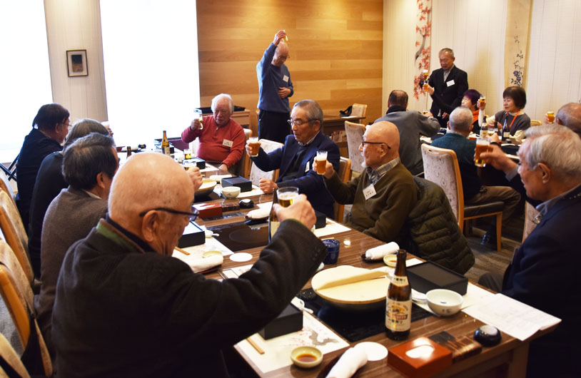 司会の挨拶、支部長の挨拶、そして長老の森さんの音頭で乾杯。引き続き森さんの指導で