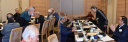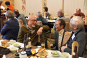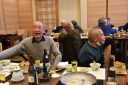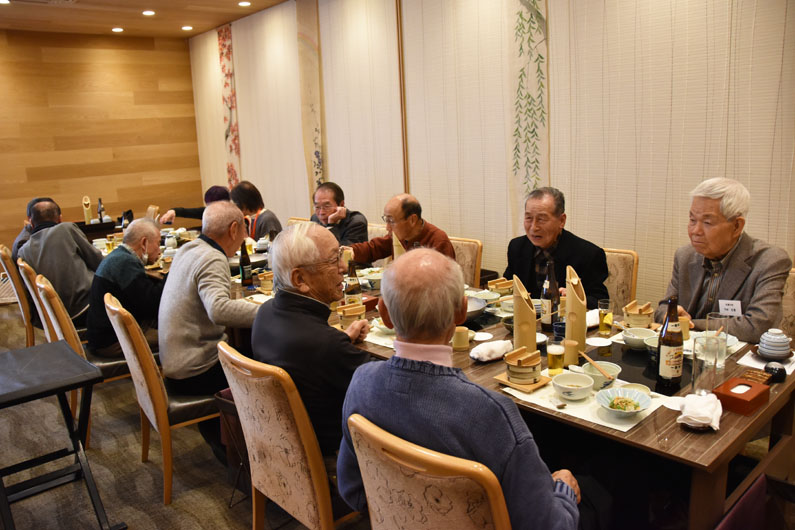 末広がり8つの円卓に参加者58名が指定テーブルに着席。飯塚支部長の新年の挨拶の後、8名の年男・2名の年女の紹介がありました。そして河村相談役の音頭で乾杯し楽しい宴は始まりました。酔わないうちに齋藤先生の病院の話に耳を傾けました。